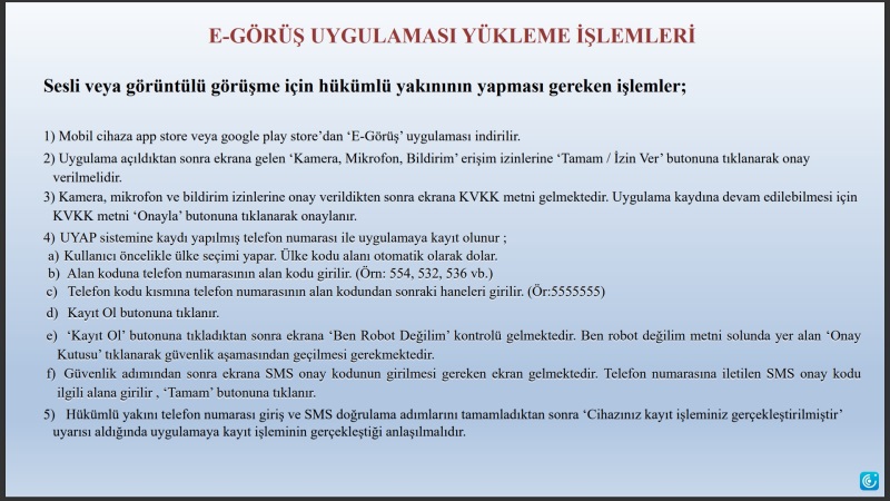 3- H/T yakınlarının, görüntülü görüşme yapabilmesi için sisteme kayıtlı (telefon görüşme formunda hükümlü tarafından kuruma bildirilen 1 adet mobil numaralı telefonu) telefonlarının bulunduğu mobil cihazlardan Android ve IOS internet mağazalarında bulunan E-Görüş mobil uygulamasını indirerek kurulum yapmaları gerektiğinden;
