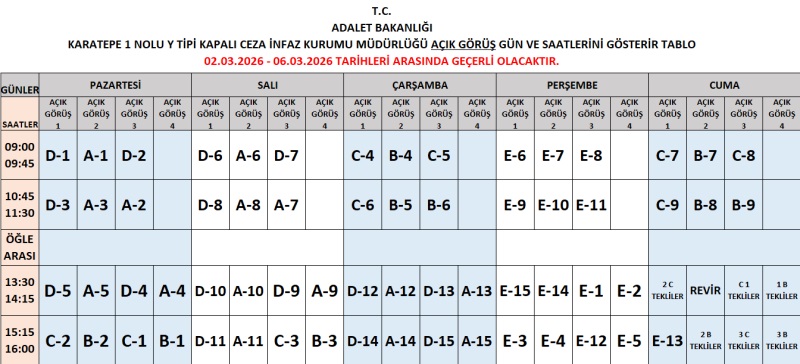 KARATEPE 1 NOLU Y TİPİ KAPALI CEZA İNFAZ KURUMU 02.03.2026 - 06.03.2026 TARİHLERİ ARASI AÇIK GÖRÜŞ TABLOSU